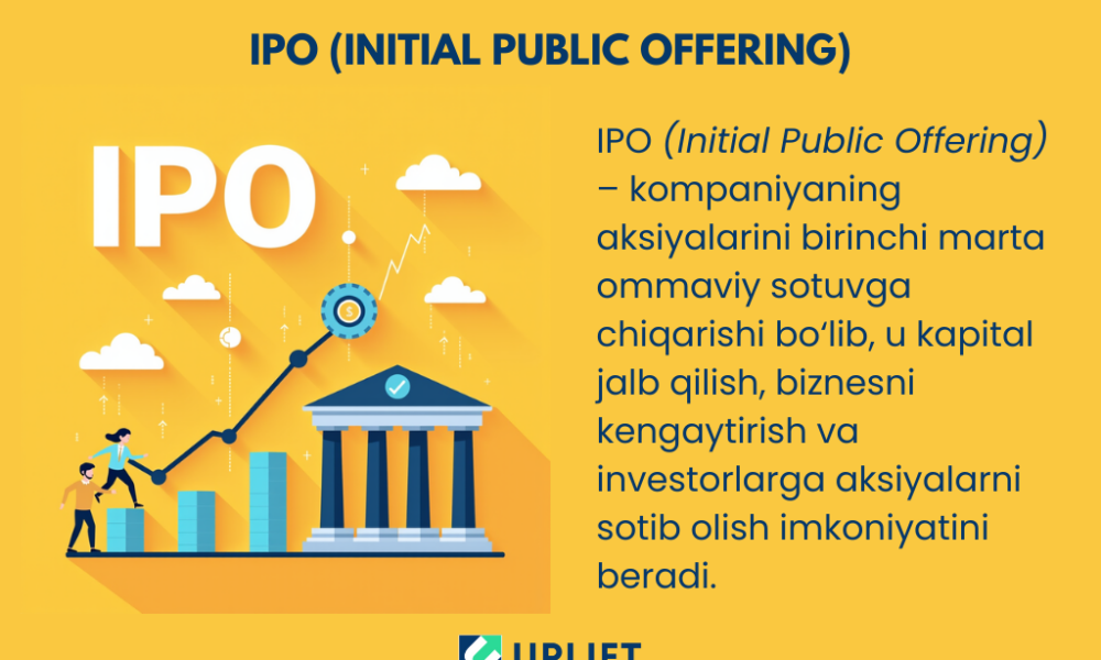 IPO (Initial Public Offering) – bu kompaniyaning aksiyalarini ilk bor ommaga sotuvga chiqarish jarayoni bo‘lib, u kompaniyalarga yangi investorlarni jalb qilish, kapitalni oshirish va bozor qiymatini mustahkamlash imkonini beradi.