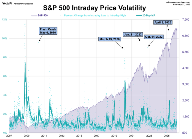Yopilish narxi bilan kun ichidagi volatillik o‘rtasidagi bog‘liqlikni ko‘rish uchun quyidagi grafikda S&P 500 (2007-yildan buyon) intraday narx diapazoni bilan birga ko‘rsatilgan.