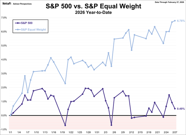 Yil boshidan buyon (YTD) S&P 500 atigi +0,49% ga oshgan bo‘lsa, S&P Equal Weight +6,78% o‘sishni qayd etdi.
