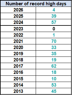 Quyidagi jadval 2013-yildan buyon har yili qayd etilgan tarixiy maksimumlar sonini umumlashtirib ko‘rsatadi.