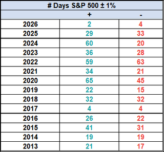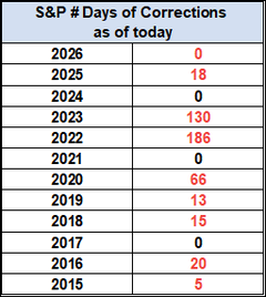 Quyida har ikki yo‘nalishda 1% yoki undan katta o‘zgarish kuzatilgan kunlar soni hamda korreksiya kunlari (ya’ni tarixiy maksimumdan 10% yoki undan ko‘proq pasayish) bo‘yicha bir nechta jadval keltirilgan.